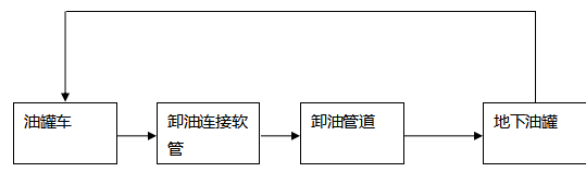 卸油工艺:油罐车行驶至加油站内密封卸油口停车处,利用油罐车与地下储油罐的高位差,采用密闭式卸油。采用油气回收系统,在油罐车卸油过程中,将原来储油罐内散溢的油气,通过油气回收地下工艺管线及卸车软管重新收集至油罐车内,实现卸油与油气等体积置换。其工艺流程如下图: