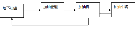 加油工艺:加油作业时,采用潜油泵提供的动力,油品通过加油管道至加油机,进入受油容器。同时,加汽油作业时,有油气回收回收系统,汽油蒸汽通过油气回收管道回至汽油罐。具体流程见下图: