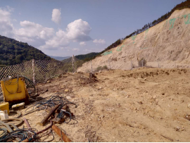 矿山将原1号采场+460m凹陷采坑一边作为排土场,该凹陷采坑边坡均为花岗岩体,较为稳固,排土场的选址满足需求。实际矿山在凹陷坑中间建一座毛石浆砌挡墙(挡墙长40m,高约3m,坝顶宽约1.5m,内外坡比约为1∶0.3),排土场有效堆排面积约3800m2,堆置高度约5m,排土场有效库容量为1.9万m³,目前现有排土场内已堆排的废石土量约0.5万m³。 |