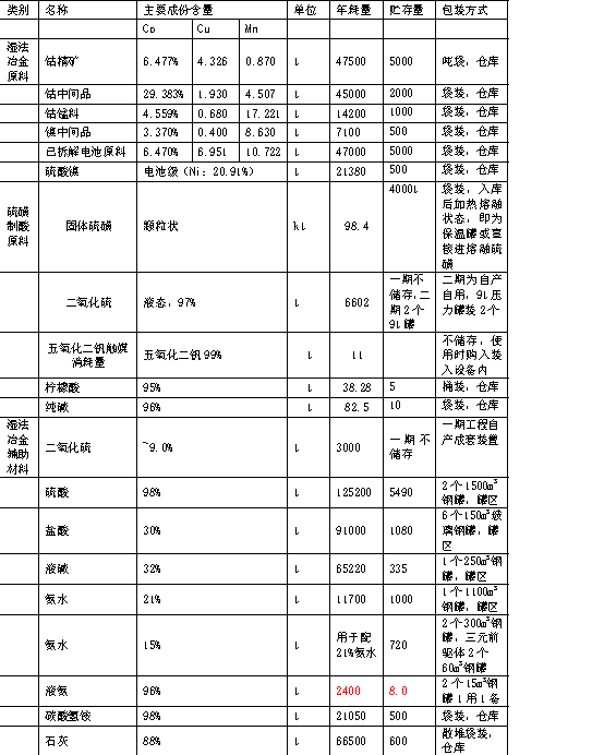 ①原料系统:一期的各原料仓库设在浸出车间1#、浸出车间2#、浸出车间3#;固体硫磺进厂后,采用快速熔硫槽熔硫后输送至地下硫磺罐作为中转槽,液硫输送焚烧炉,一期调整一个3kt/a硫磺制气态二氧化硫项目,增设氨水回收与液氨配氨水(15%增21%)。二期硫磺制酸固体硫磺进厂后,采用快速熔硫槽熔硫后输送至硫磺罐内储存。硫酸设备除汽轮发电机组、一个中控室和配电室为室内布置外,其他为露天布置。